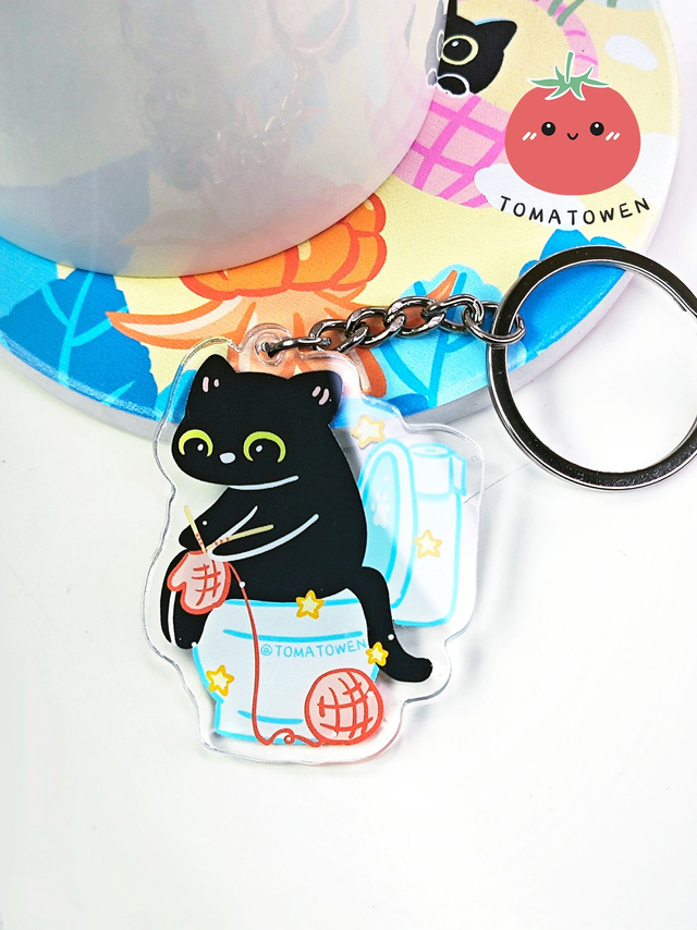 Keychain: Black cat knitting on toilet